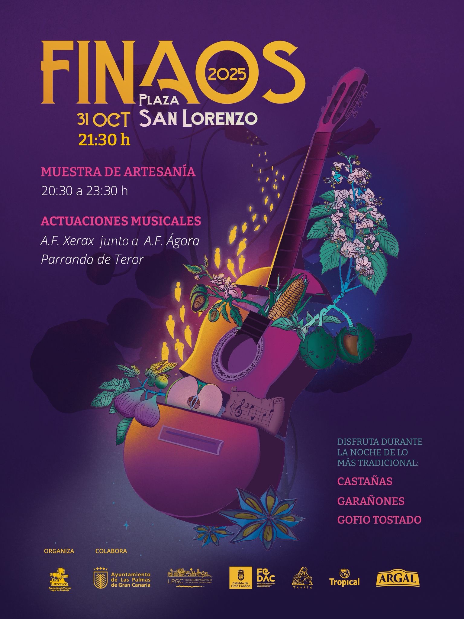 El próximo 31 de octubre, a partir de las 21:30 horas, estaremos en la Plaza de la localidad de San Lorenzo, en Las Palmas de Gran Canaria, junto a la A. F. Xerax y la A. F. Ágora, amenizando esta entrañable tradición de finaos, disfrutando de castañas, garañones y gofio tostado. ¡Te esperamos!
